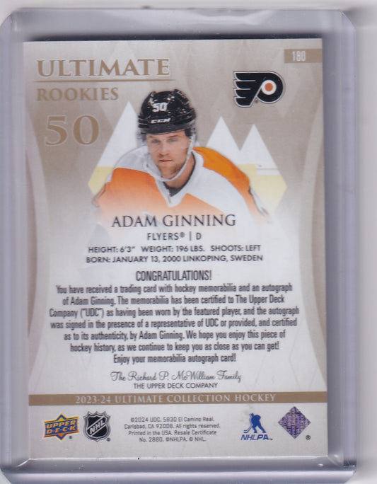 Adam Ginning Ultimate Rookie Patch Auto RPA /99 Card #180 2023-24 Upper Deck Ultimate Collection Rookie Card RC Philadelphia Flyers