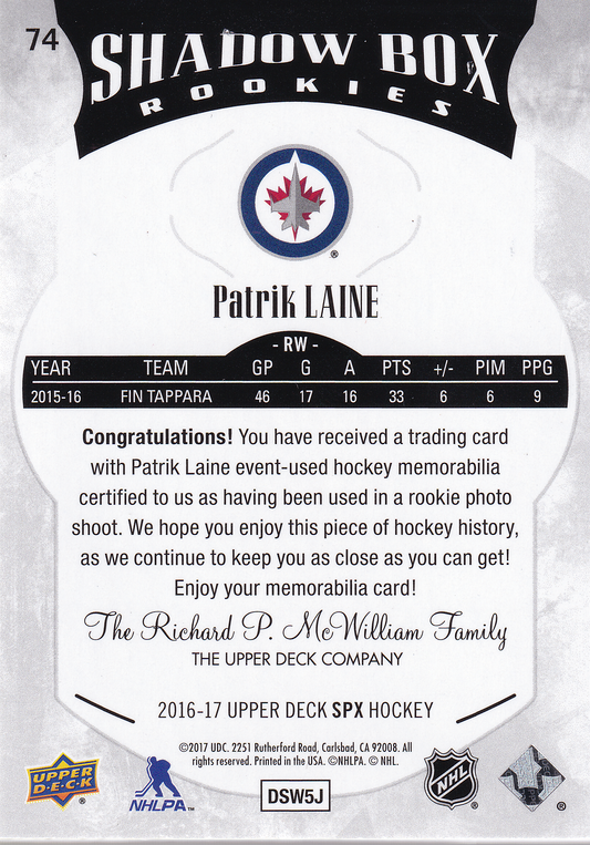2016-17 SPX PATRIK LAINE Shadow Box Rookies Jersey 121/149 Winnipeg Jets #74 RCRegular price $29.99 CADRegular priceUnit price / per-
