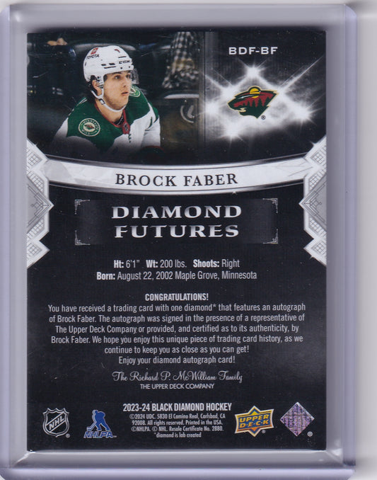 Brock Faber Diamond Futures Rookie Auto /10 BDF-BF 2023-24 Upper Deck Black Diamond Rookie Card RC Minnesota Wild