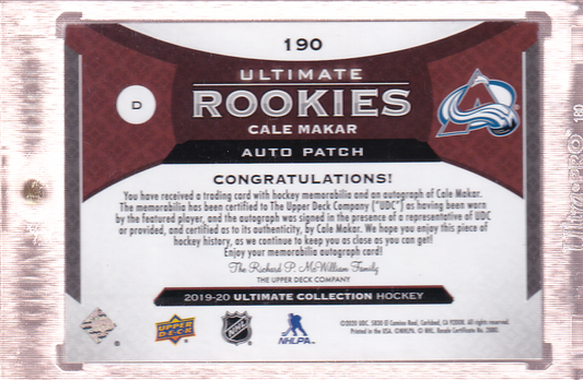 CALE MAKAR 2019-20 UD Ultimate Rookies Auto Patch Card JERSEY # 8/49 Colorado Avalanche RC