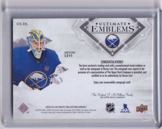 Devon Levi Ultimate Emblems Gold Rookie Auto /99 Card UE-DL 2023-24 Upper Deck Ultimate Collection Rookie Card RC Buffalo Sabres