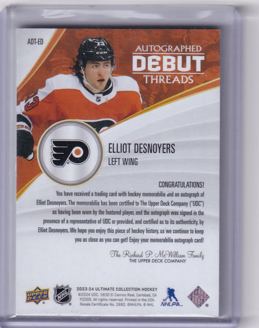 Elliot Desnoyers Autographed Debut Threads Rookie Patch Auto RPA /99 Card ADT-ED 2023-24 Upper Deck Ultimate Collection Rookie Card RC Philadelphia Flyers