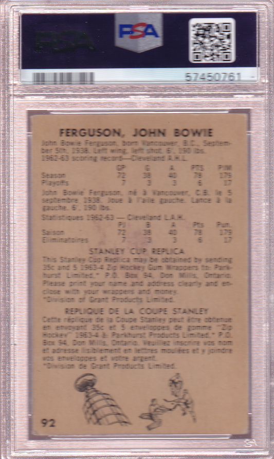 JOHN FERGUSON 1963-64 Parkhurst Rookie Card #92 RC Montreal Canadiens PSA 4