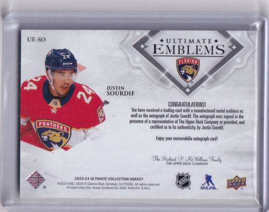 Justin Sourdif Ultimate Emblems Rookie Auto Card UE-SO 2023-24 Upper Deck Ultimate Collection Rookie Card RC Florida Panthers