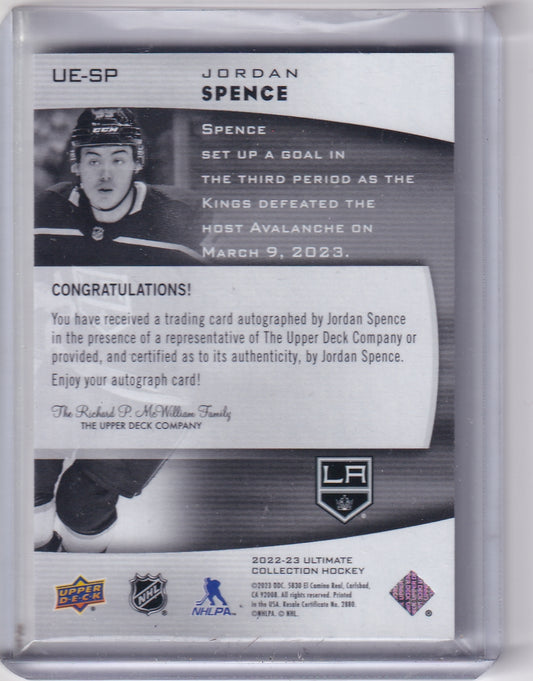 Jordan Spence Ultimate Emblems Rookie Auto Card UE-SP 2022-23 Upper Deck Ultimate Collection Rookie Card RC Los Angeles Kings (2023-24 Update)