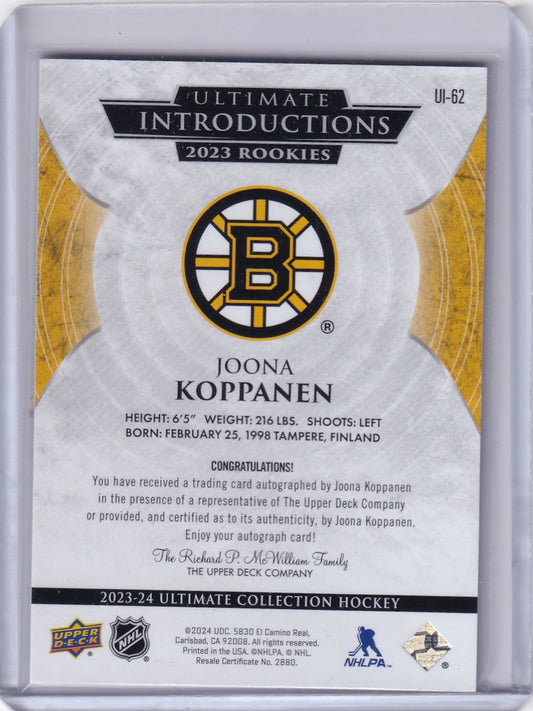 Joona Koppanen Ultimate Introductions Rookie Auto Card UI-62 2023-24 Upper Deck Ultimate Collection Rookie Card RC Boston Bruins