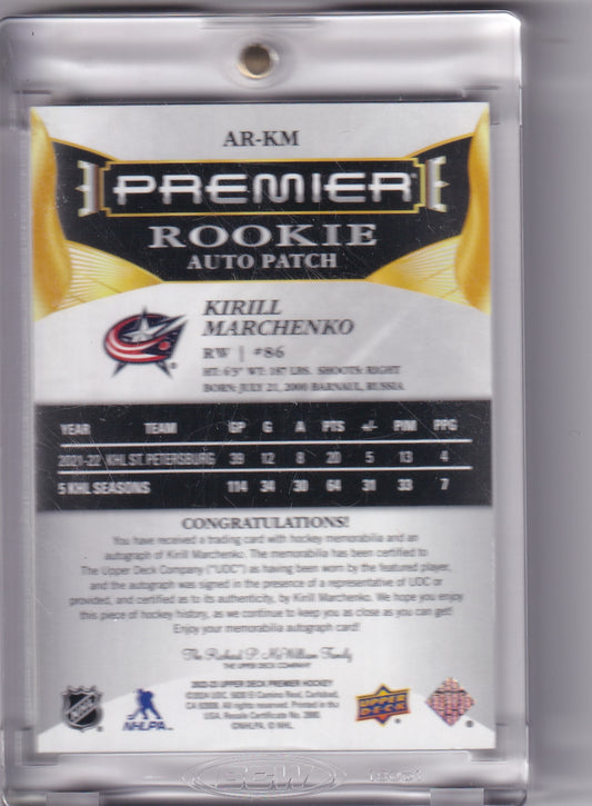 Kirill Marchenko Rookie Patch Auto RPA /249 AR-KM 2022-23 Upper Deck Premier Rookie Card RC Columbus Blue Jackets