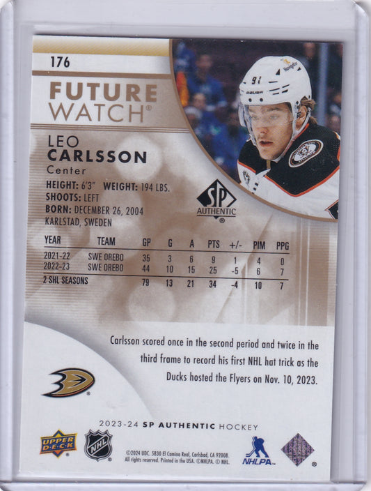 Leo Carlsson Future Watch Limited Gold /99 #176 2023-24 Upper Deck SP Authentic Rookie Card RC Anaheim Ducks