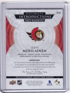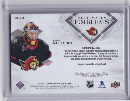 Leevi Merilainen Ultimate Emblems Rookie Auto Card UE-LM 2023-24 Upper Deck Ultimate Collection Rookie Card RC Ottawa Senators