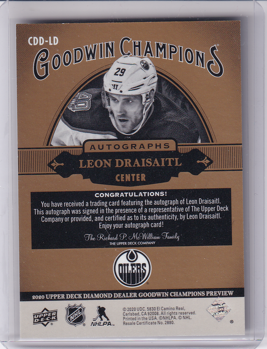 LEON DRAISAITL 2020 UD Diamond Dealers Exclusives Goodwin Champions Autograph CDD-LD Edmonton Oilers