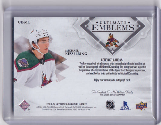 Michael Kesselring Ultimate Emblems Rookie Auto Card UE-ML 2023-24 Upper Deck Ultimate Collection Rookie Card RC Arizona Coyotes