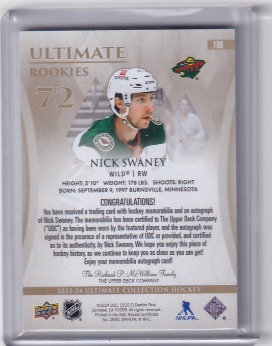 Nick Swaney Ultimate Rookie Jersey /599 Card #188 2023-24 Upper Deck Ultimate Collection Rookie Card RC Minnesota Wild