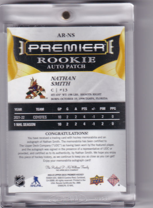 Nathan Smith Rookie Patch Auto /249 AR-NS 2022-23 Upper Deck Premier Rookie Card RC Arizona Coyotes