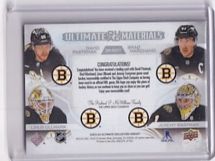 Pastrnak Marchand Ullmark Swayman Ultimate Quad Materials Jersey /65 Card QM-BOST 2023-24 Upper Deck Ultimate Collection Boston Bruins
