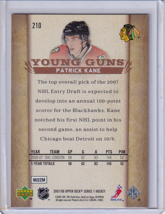 PATRICK KANE 2007-08 Upper Deck UD Young Guns Rookie Card RC #210 Chicago Blackhawks #3