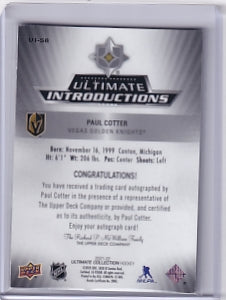 Paul Cotter Ultimate Introductions Rookie Auto /10 Card UI-58 2021-22 Upper Deck Ultimate Collection Rookie Card RC Vegas Golden Knights (2023-24 Update)