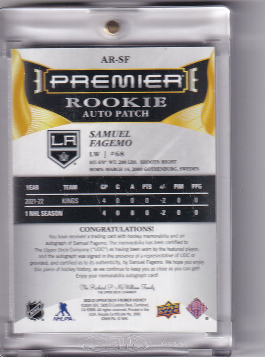 Samuel Fagemo Rookie Patch Auto /249 AR-SF 2022-23 Upper Deck Premier Rookie Card RC Los Angeles Kings
