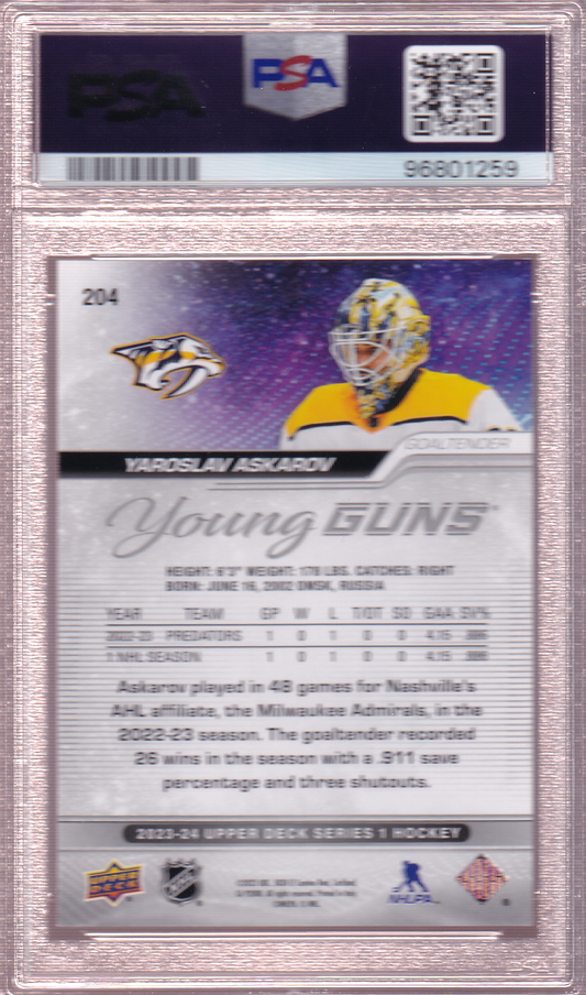 YAROSLAV ASKAROV 2023-24 Upper Deck UD Young Guns Rookie Card PSA 10 RC #204 Nashville Predators