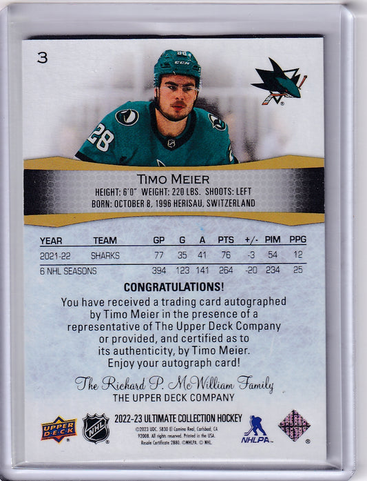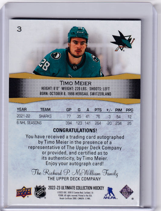 Timo Meier Ultimate Auto Card #3 2022-23 Upper Deck Ultimate Collection San Jose Sharks (2023-24 Update)