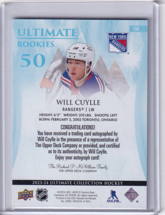 Will Cuylle Ultimate Rookies Auto Card /299 #104 2023-24 Upper deck Ultimate Collection Rookie Card RC New York Rangers