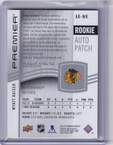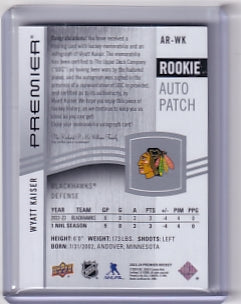 Wyatt Kaiser Premier Rookie Auto Patch 107/249 Card AR-WK 2023-24 Upper Deck Premier Rookie Card RC Chicago Blackhawks