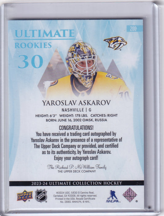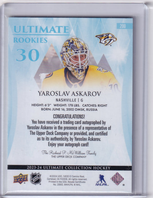 Yaroslav Askarov Ultimate Rookies Auto Card /299 #200 2023-24 Upper deck Ultimate Collection Rookie Card RC Nashville Predators