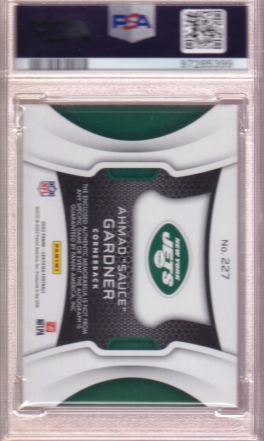 AHMAD "sauce" GARDNER 2022 Panini Certified Signature jersey /349 Rookie Card RC #227 PSA 10 New York Jets