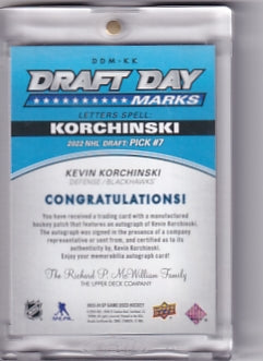 Kevin Korchinski Draft Day Marks Auto 25/35 Card DDM-KK 2023-24 Upper Deck SP Game Used Rookie Card RC Chicago Blackhawks