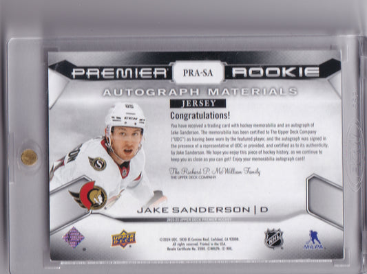 Jake Sanderson Premier Rookie Autograph Materials /25 PRA-SA 2022-23 Upper Deck Premier Rookie Card RC Ottawa Senators