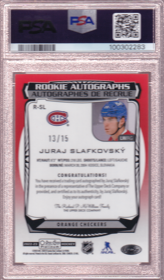 JURAJ SLAFKOVSKY 2022-23 O-Pee-Chee Platinum Orange Checkers 13/15 Rookie Autograph Card #R-SL OPC PSA 10 RC Montreal Canadiens