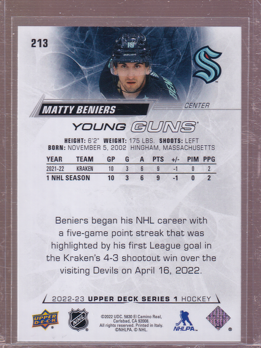 MATTY BENIERS 2022-23 Upper Deck Young Guns Rookie Card #213 RC SEATTLE KRAKEN