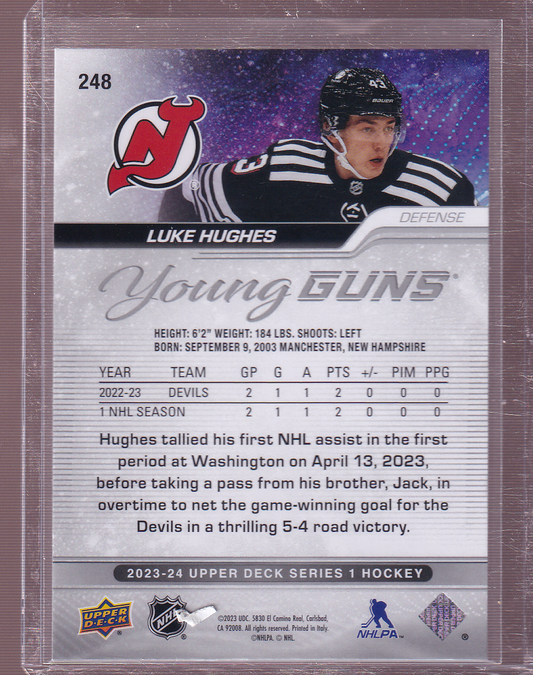LUKE HUGHES 2023-24 Upper Deck Young Guns Rookie Card #248 RC NEW JERSEY DEVILS