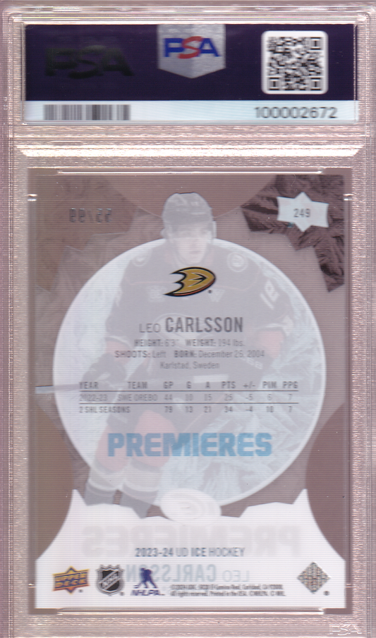 LEO CARLSSON 2023-24 UD Ice Rookie Premieres Card 55/99 RC #249 PSA 9 Anaheim Ducks