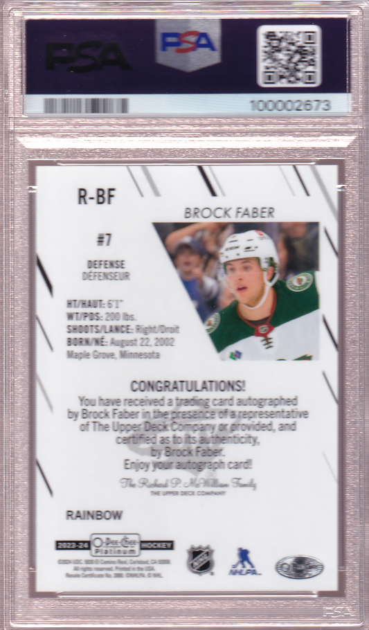 BROCK FABER 2023-24 O-Pee-Chee Platinum Rainbow Rookie Autograph Card RC #R-BF PSA 9 Minnesota Wild