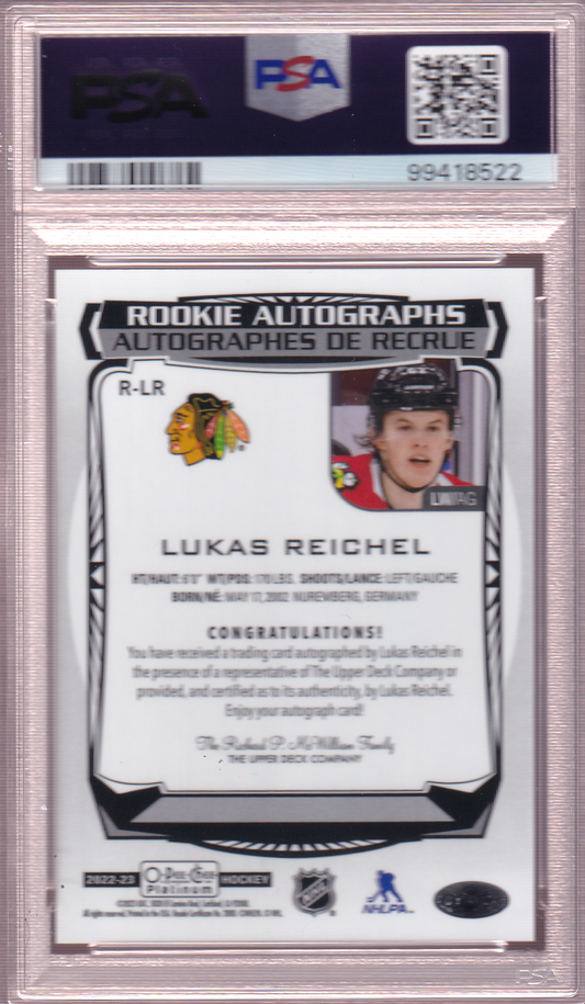 LUKAS REICHEL 2022-23 O-Pee-Chee Platinum Rookie Autograph card #R-LR PSA 10 Chicago Blackhawks OPC Auto RC