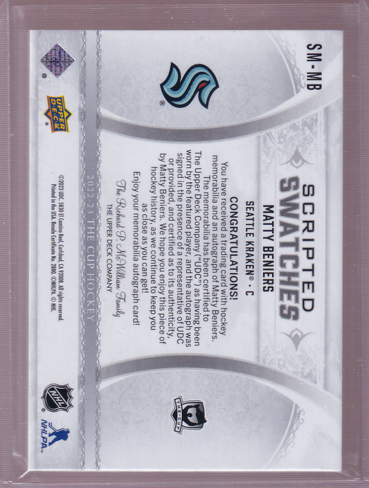 MATTY BENIERS 2022-23 UD The Cup Scripted Swatches Auto Patch 29/35 Card #SM-MB Seattle Kraken