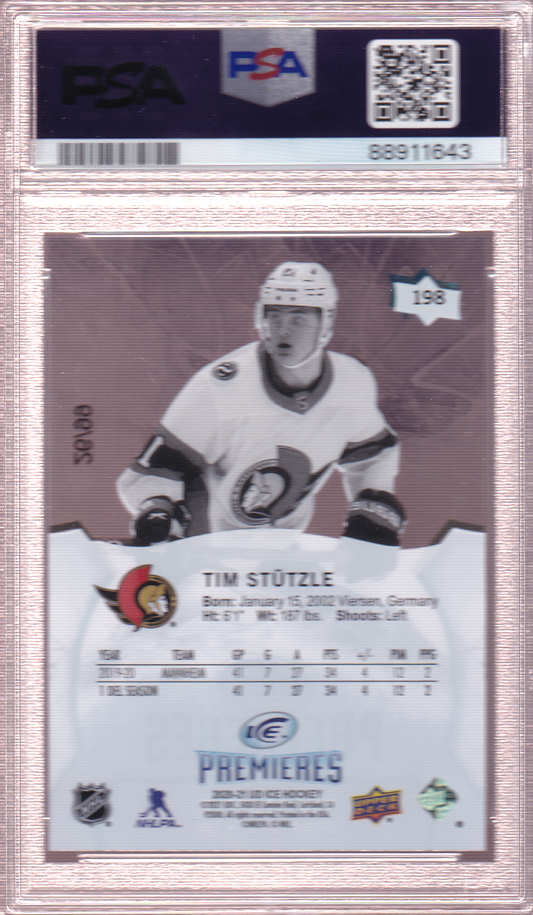 Tim Stutzle 2020-21 UD Ice Premieres Rookie Card /99 RC #198 PSA 9 Ottawa Senators
