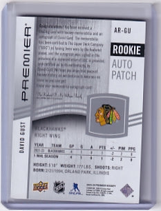 David Gust Premier Rookie Auto Patch 053/249 Card AR-GU 2023-24 Upper Deck Premier Rookie Card RC Chicago Blackhawks