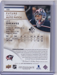 Jet Greaves Future Watch Patch Auto 050/100 Card #155 2023-24 SP Authentic Rookie Card RC Columbus Blue Jackets