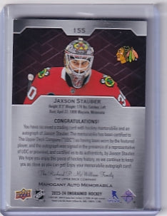 Jaxson Stauber Engrained Rookie Mahogany Patch Auto 29/49 Card #155 2023-24 Upper Deck Engrained Rookie Card RC Chicago Blackhawks