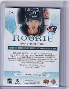 Kent Johnson Rookie Patch Jersey 93/99 Card #200 2022-23 Upper Deck Artifacts Rookie Card RC Columbus Blue Jackets