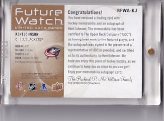 Kent Johnson Retro Future Watch Patch Auto 17/50 Card RFWA-KJ 2022-23 Upper Deck SP Authentic Rookie Card RC Columbus Blue Jackets