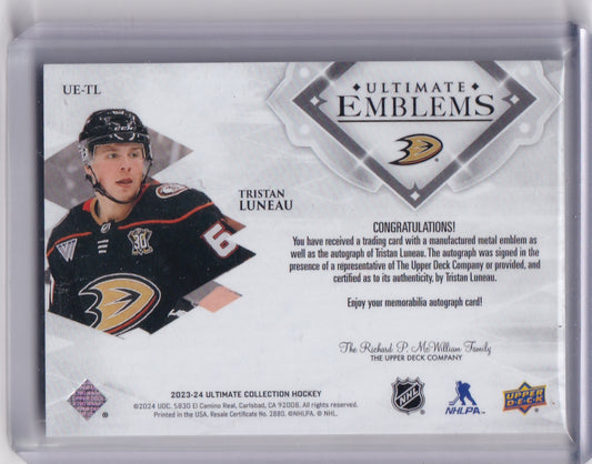 Tristan Luneau Ultimate Rookie Emblems Auto Card UE-TL 2023-24 Upper Deck Ultimate Collection Rookie Card RC Anaheim Ducks